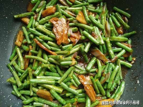 4、放入豆角,转成大火,继续翻炒几分钟,直到豆角起皮褶皱。