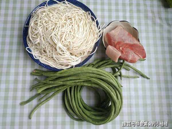 1、准备食材,豆角一把切成条、面条适量、五花肉适量切成片,葱和大蒜切一下,豆角一定要去除两头和根茎,不然吃到很难受。