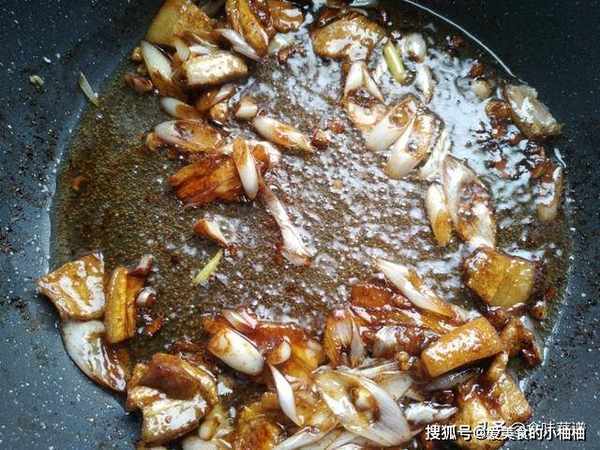 3、下入五花肉煸炒一下,开始调味,加入生抽、盐、蚝油、糖,继续翻炒,逼出猪油。