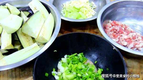 茄子去蒂以后,切成5厘米左右的段。肥瘦相间的五花肉一小块,切成碎粒。生姜先切成碎末,大葱切成圈,大蒜切成碎末。