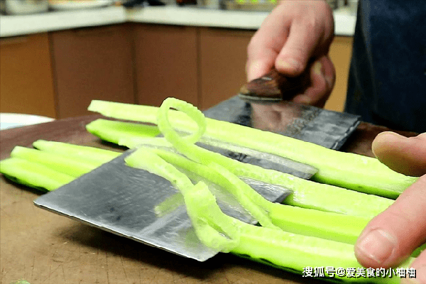 准备黄瓜一根,削皮。用刀划成四半,削去里面的瓜瓤。