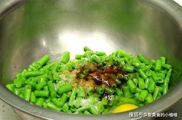 然后把豆角沥干水分,放盆里。加盐、味精、少许糖、十三香、蚝油调味,磕进去一个鸡蛋,颠盆携捞均匀,再把红椒粒放进去。