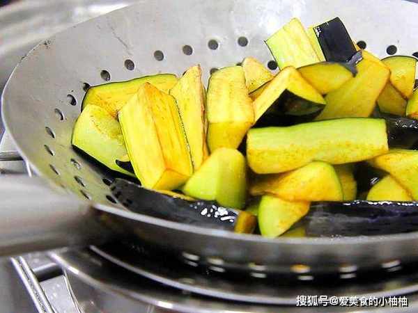 把茄子过油炸一下,锅内烧油,倒入植物油,油温烧至6成热时。倒入茄子,把茄子炸软炸透。