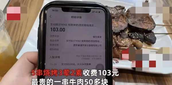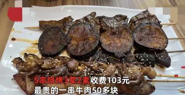 近日,在陕西西安。一女子发视频称自己和朋友打算吃点烧烤,就找了一家烧烤店,本来想着一顿烧烤正常也就三五百元,却没想到遇到了传说中的烧烤刺客。该女子总共点了5串烧烤3荤2素收费103元,最贵的一串牛肉50多块。该女子表示,自己购买时没有看到价格标签,也忘了问价,却只能自认倒霉。而联系美食广场负责人事后回应:该店的烧烤有明码标价,绝对不存在欺骗消费者的行为,可能顾客没有看到价格,他家烧烤本身就很贵,但是份量很大。所以价格稍微高于市场价也情理之中。对此,该女子表示,以后再想吃烧烤,一定要看清价格,这件事,只能是哑巴吃黄连,有苦说不出了。