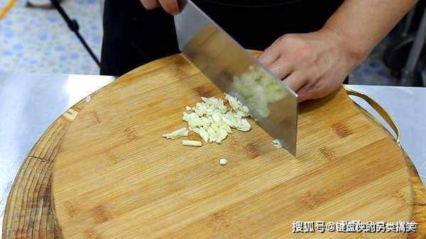 大蒜拍扁,切成碎末放在碗里备用,红椒一个,切去根部,从中间切开,除去里面的辣椒籽,切成细丝放在碗里备用。