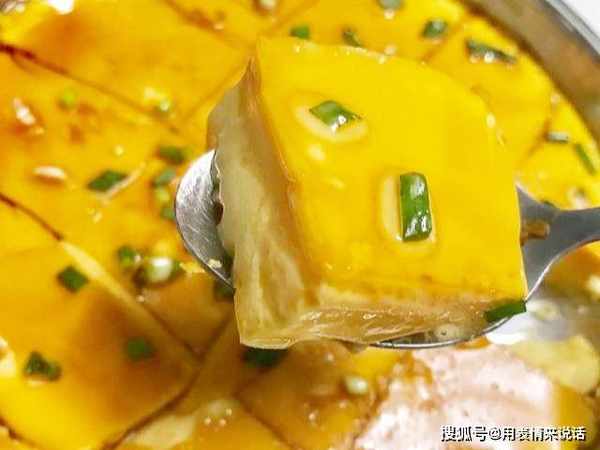 5、等时间到了,打开看一看,妥妥的镜面鸡蛋羹,生抽、醋、芝麻香油、葱花,鸡蛋羹内部没有气孔,表面非常的平滑。
