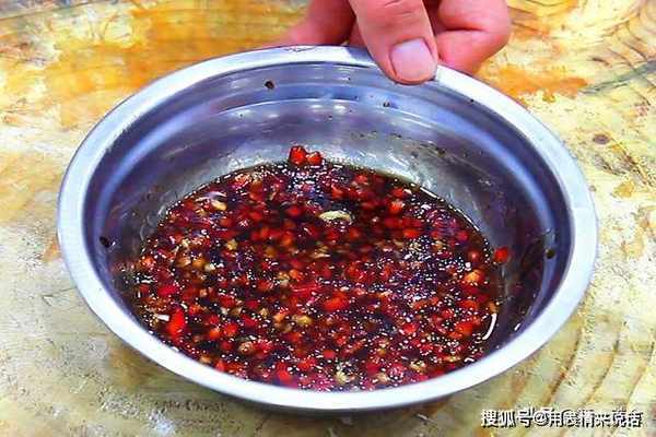 锅内烧油,油温升至七成热、油面冒青烟时起锅,把热油浇在蒜末上面激出香味、美味即成。