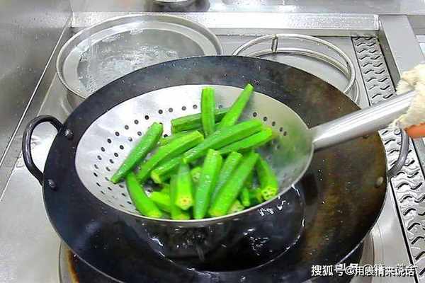 锅内烧水,大火烧开以后倒入秋葵焯水1分钟,去除秋葵中的草酸、鞣质和黏性成分,这样吃起来不会黏滑苦涩。一分钟以后把秋葵捞出来,快速过一下凉水,保持清脆的口感。