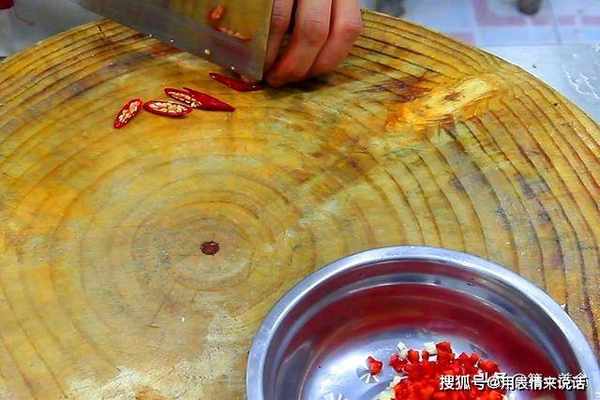 准备适量的大蒜,拍扁后切成蒜末;再切一点红椒粒用来搭配颜色;再切一点小米椒圈用来摆盘。