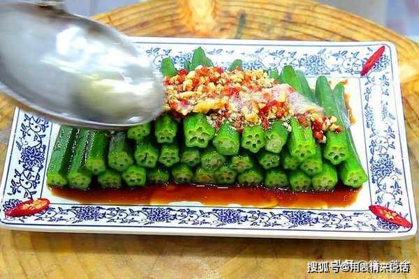 秋葵沥干水分以后一次摆放在盘中,均匀浇上调料的料汁,再放上红椒圈点缀一下、等待激油。