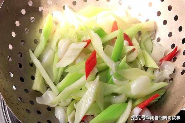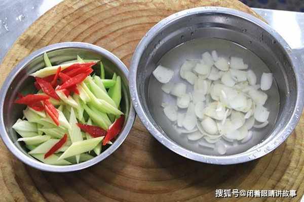 鲜百合去根、用清水浸泡洗干净;芹菜洗净,把比较粗的化开,切成菱形片;再切点红椒片配色用。