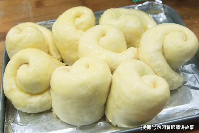 面团发酵好以后揉搓排气,切成大小均匀的面剂子,把面剂子擀成舌状、卷成卷,从中间切开做成面包生坯,然后在生坯的底部沾点水,再蘸上一层油酥,烤盘刷油把生坯放进去再次发酵10分钟。