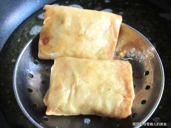 2,春卷皮放上春卷馅,裹紧用面糊封口,放到七成热的油里,炸至金黄捞出控油即成。
