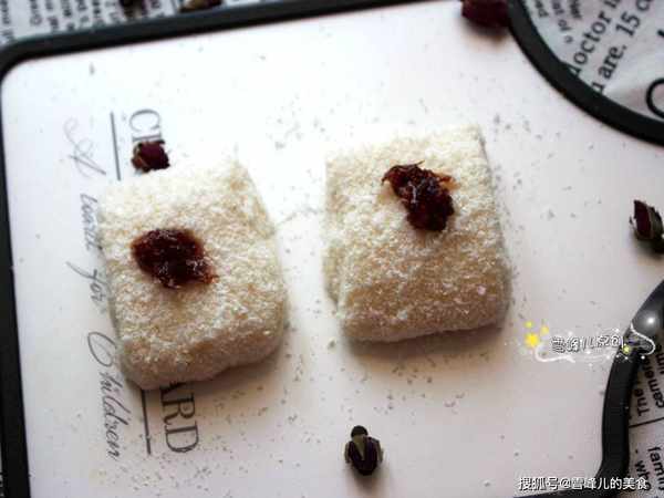 2,切成块,上面点缀玫瑰桂花酱,太阳米糕就做好了,也可以做成圆形的。