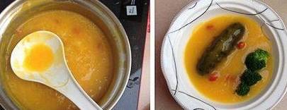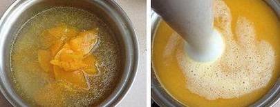 9、将鸡汤同蒸好的南瓜回锅。进行二次调味,这里可以加盐和一点点儿耗油,尽量避免用有色调料。我用了盐和一点儿糖。