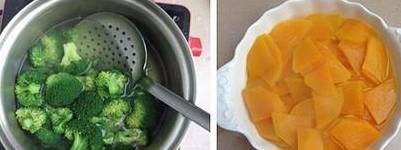 材料:发好的海参,鸡汤,南瓜,西兰花,枸杞。