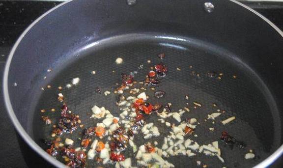 4,热锅,放入适量的食用油,爆香辣椒和蒜末