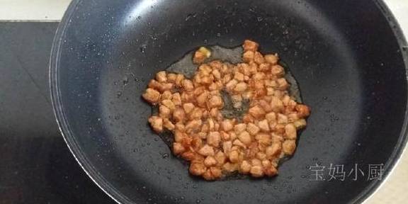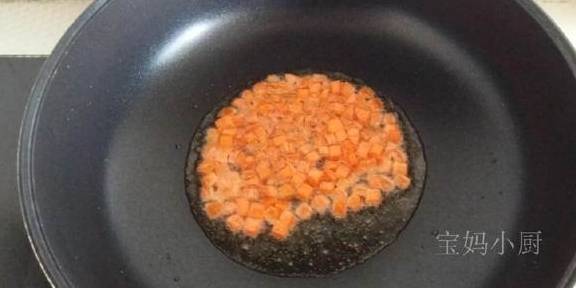 3炒锅加植物油,油温4成热,放入胡萝卜丁小火煸炒,胡萝卜丁变软,盛出备用