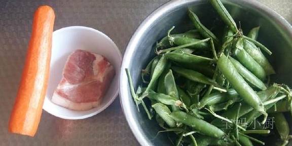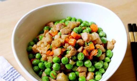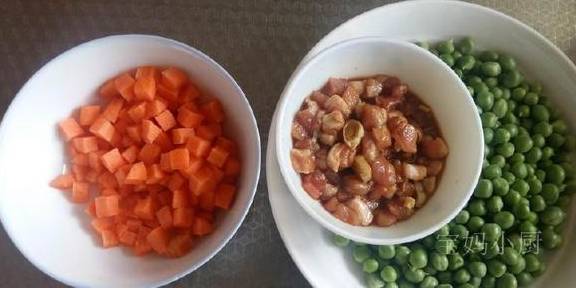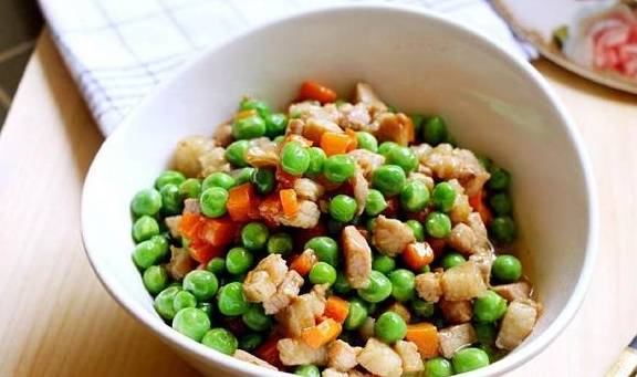 食材:剥去皮的豌豆180克,胡萝卜70克,肥瘦猪肉100克,葱姜末适量,生抽1勺,淀粉1勺,料酒半勺,盐适量,植物油适量