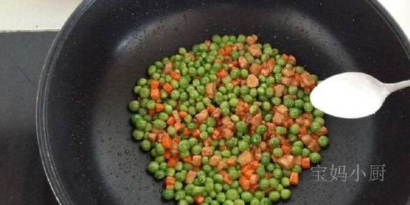 5放入豌豆、煸软的胡萝卜丁,大火翻炒均匀