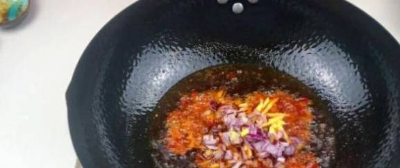 2、在锅里放入油,倒入蒜末爆香,加入洋葱、猪肉、蚝油、豆瓣酱翻炒均匀,加入温水;