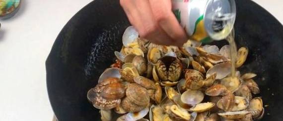 准备材料:啤酒、葱花、姜丝、郫县豆瓣酱、蒜末、洋葱、生抽、青椒、小米椒、蚝油、食盐和花蛤。