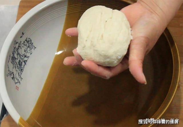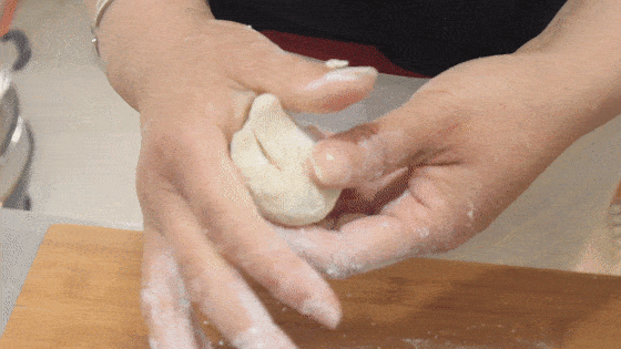 把面剂子放在虎口处,向里摁压收紧,团成圆面坯