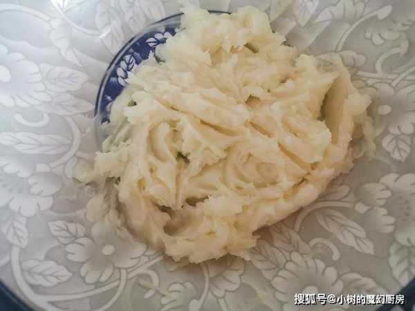 2、蒸好的土豆,倒入一个大一点的盆中,加入2克食盐,趁热用勺子压成细腻的土豆泥,尽量压得细一些。