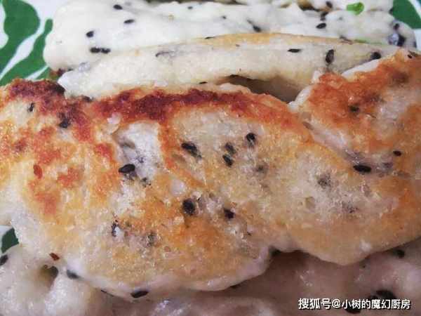 6、松弛好之后,开火,选择水煎包按键,煎到底部微黄,接着倒入适量的清水,盖上盖子煎到水分收干,撒上葱花,土豆花卷完全成熟就可以了。
