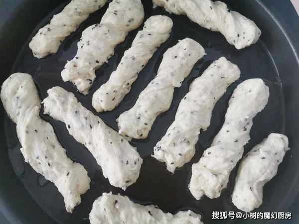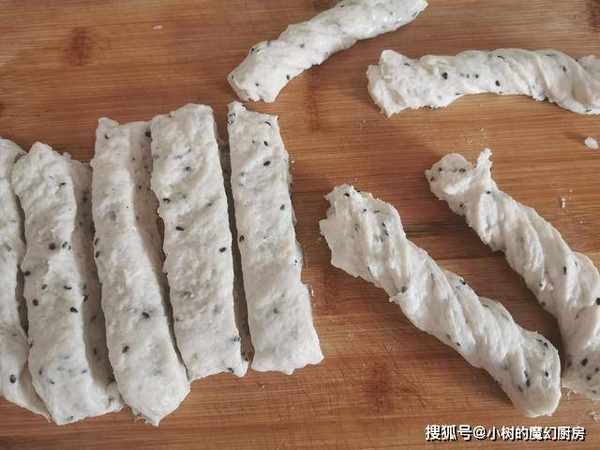 4、我们在案板上抹上一些食用油,防止粘连,把发酵好的面团拿出来稍微揉一下,整理成长条,按扁,切成两指宽的条状,再拿起条状面,稍微拉长一些,再扭上几圈,这样生胚就做好了。