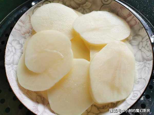 1、首先把土豆洗净,去皮,之后切成薄片,大约有200克,上锅蒸熟。