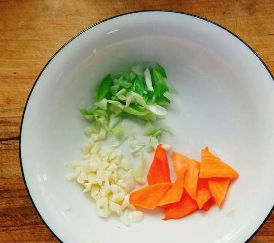 6.胡萝卜、葱切成片,蒜切成末