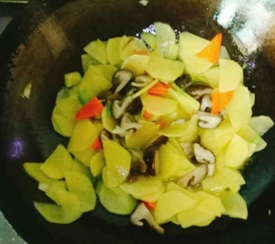 7.锅里放油,放入胡萝卜、葱翻炒,放入土豆片炒熟