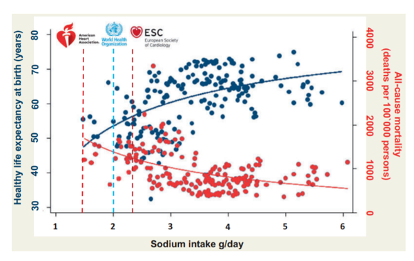 2014年,一項涉及13萬例受試者的匯總分析顯示:每日鈉鹽攝入<3 g者,發生心血管事件及死亡的風險均新增。