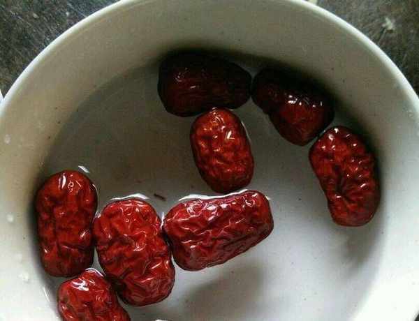 3.因为炖的时候会一起加红枣,所以做一些红枣,不要太多,几个就可以了。最好选择果肉多的大枣。大枣直接洗净,用水浸泡。