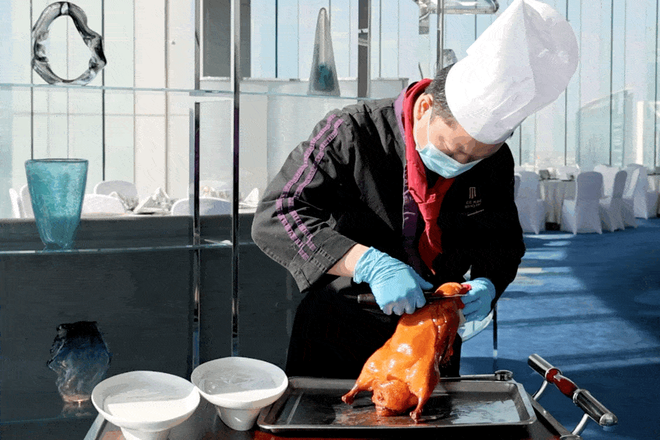 师傅手起刀落,手中的烤鸭宛如艺术品般