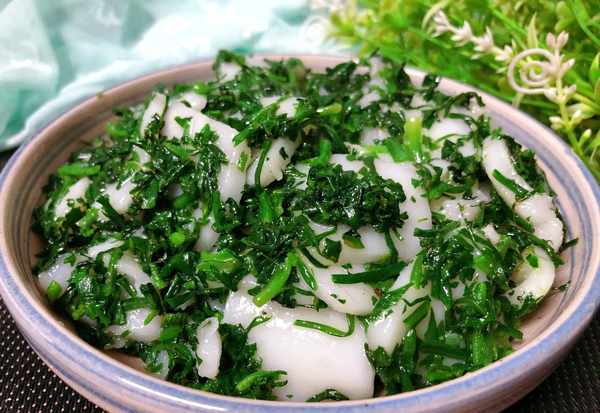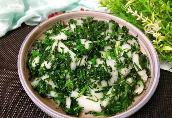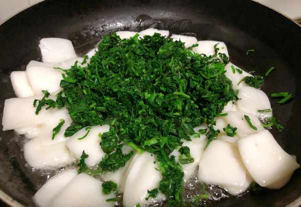 (5)锅中油热,依次倒入年糕和荠菜炒匀,然后加盐,鸡精调一下味道,炒匀出锅