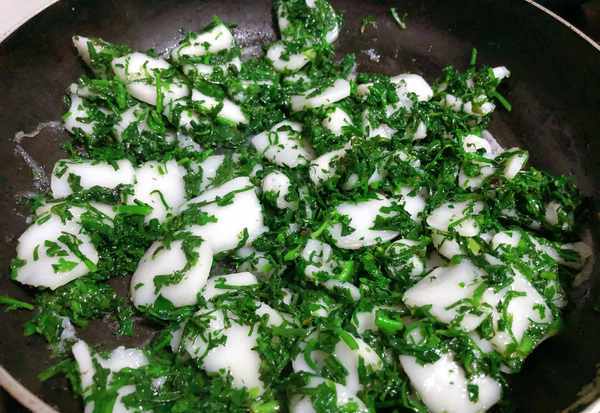 (3)再烧一锅水,加一勺盐和1勺食用油,把荠菜放进去烫15-20秒,变色即可捞出来
