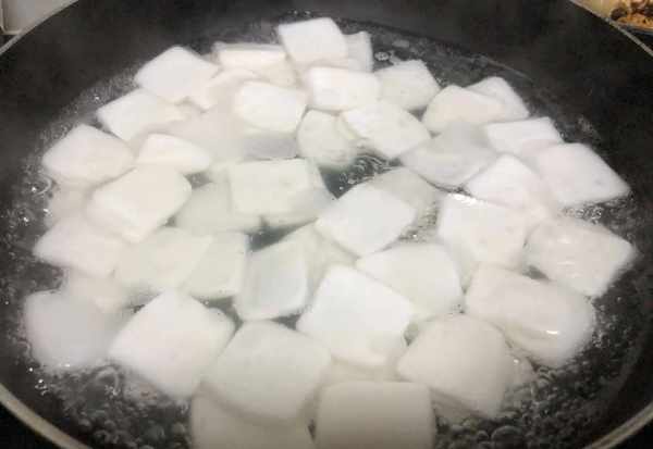 (2)锅中水开放入年糕片煮1分钟,捞出来过一遍清水