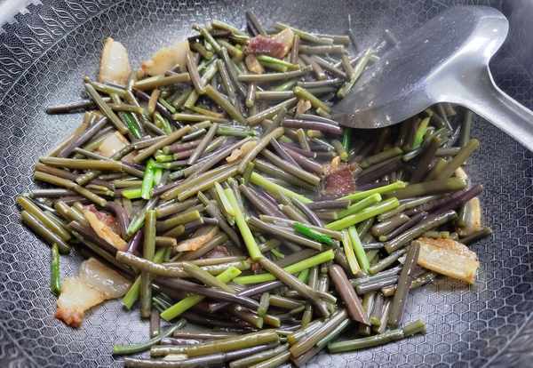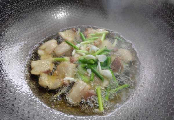 第四步:热锅倒油,放入肥猪肉煸炒至出油后,再放入大蒜梗,煸炒出香味。