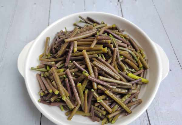 第三步:挑选鲜嫩的蕨菜,处理干净,放入开水锅中,大火煮上两三分钟,再捞出用清水浸泡一两个小时,把蕨菜切成小段,沥干水分。蕨菜一定要焯水,一来可以去除蕨菜中的苦涩味,二来可以去除蕨菜中的毒素。蕨菜采摘后,暂时不吃的,一定要焯水浸泡后,再放冰箱保存,这样蕨菜才不会变老。