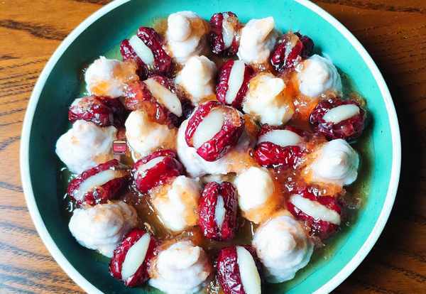 4、 将红枣糯米团子码进盘中,上锅蒸制20分钟,出锅后摆上山药泥,再淋上少许草莓果酱即可食用。