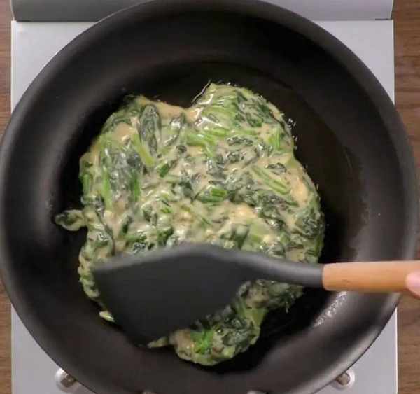 锅内烧热,放入油,晃晃锅使锅底都沾上油,倒入菠菜蛋糊,中小火煎成型后,用筷子辅助铲子翻面,再煎一会儿使面糊熟透,两面金黄。