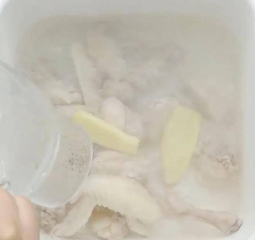 鸡洗净后切块,放入锅中,加清水没过鸡肉,放入2片姜,煮开,撇清浮沫,捞出鸡肉。 如果想要汤水不那么油腻,可以事先把鸡皮都去掉。