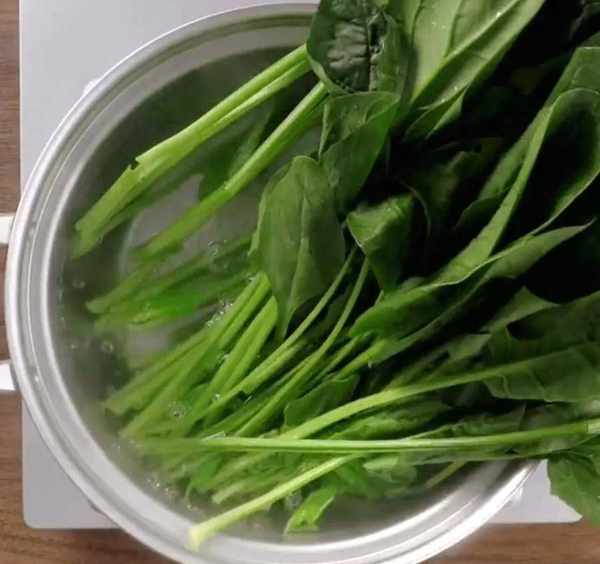 锅内烧开水,放入洗干净去根的菠菜,加几滴油和一小撮盐,汆烫后捞出过凉水,用手攥干菠菜的水分,切碎,备用。