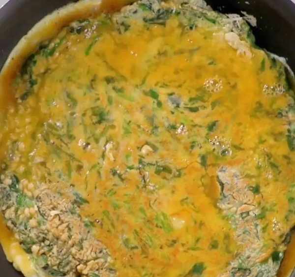 再淋上纯蛋液,待蛋液成型后翻面煎至两面金黄即可。