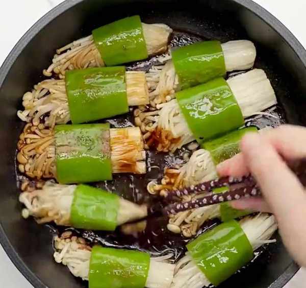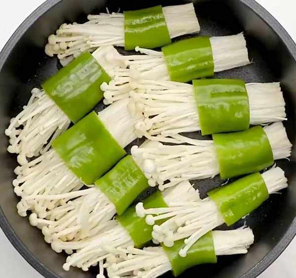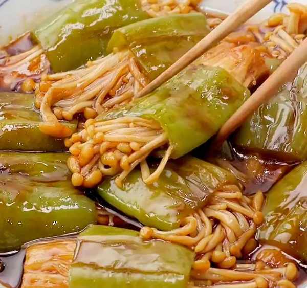 用料 青椒3个金针菇250g食用油10g生抽10g 老抽10g蚝油10g醋10g盐1g白糖5g
