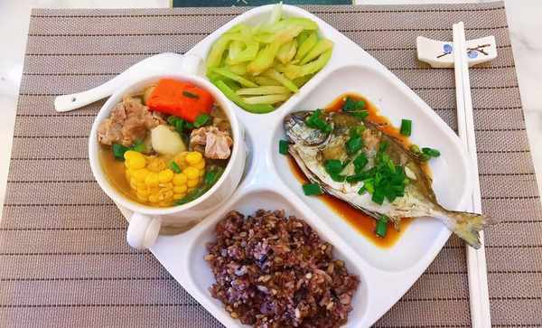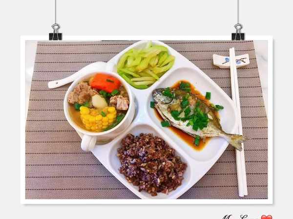 午餐:清蒸泥猛鱼、排骨玉米马蹄汤、西芹、杂粮饭。