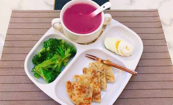 早餐:紫薯银耳羹、鸡胸肉大葱饼、西兰花、鸡蛋。