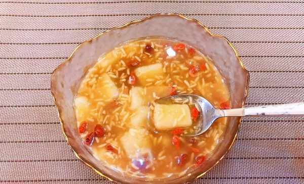 1. 糍粑切块,取2勺甜酒、1勺枸杞、1小块红糖。